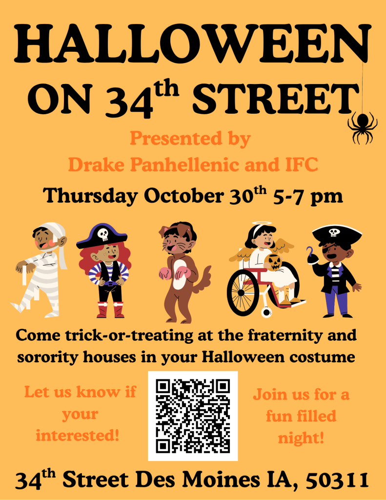 Drake Panhellenic and IFC will be hosting trick-or-treating on 34th Street at the sorority and fraternity houses. The event will be on Thursday, Oct. 30, from 5–7 p.m. We would love to have everyone join us for a fun-filled night of candy, games, and more.