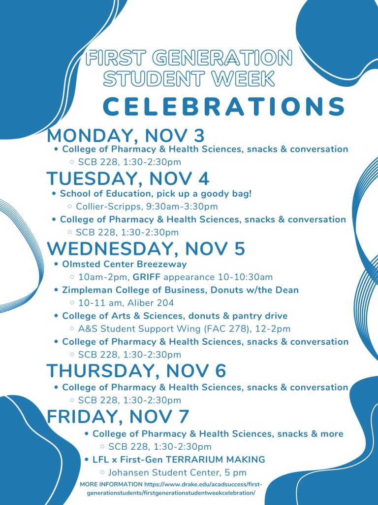 The Office of New Student and Family Programs, Drake First Gen Bulldogs (student organization), and college and school academic offices are partnering to celebrate Drake first-generation students, staff, and faculty.