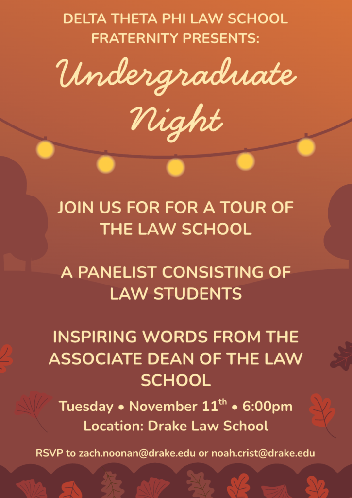 If you are considering law school—at Drake or anywhere—Drake Law School’s chapter of Delta Theta Phi invites you to Undergrad Night at Drake Law on Tuesday, Nov. 11, at 6 p.m. Associate Dean Gaughan will share brief remarks, followed by a candid Q&A with current Drake Law students, and a tour of the law school.