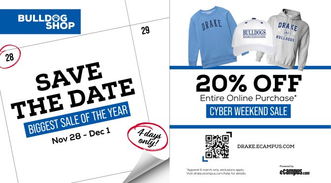 Mark your calendars, Bulldogs! From Nov. 28 to Dec. 1, enjoy 20% off (almost) everything online at drake.ecampus.com.