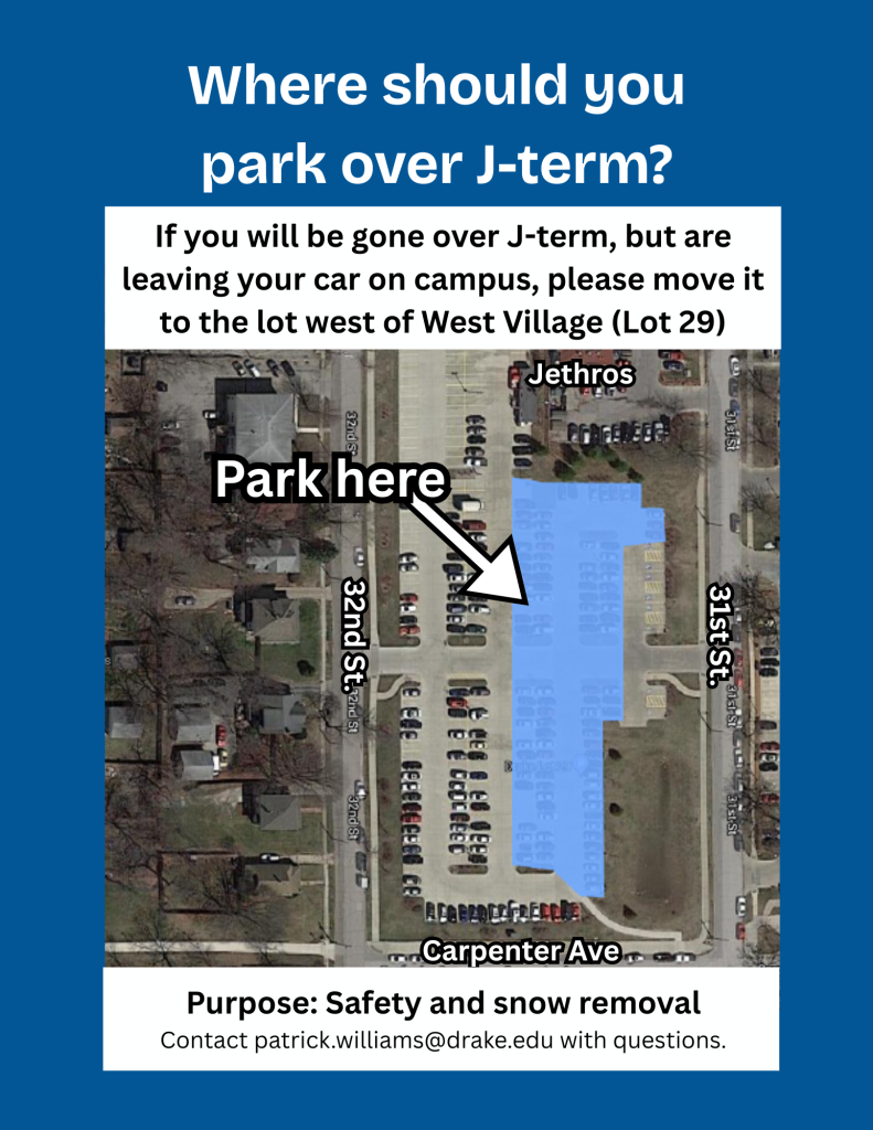 If you are leaving for J-Term, but plan to leave your vehicle on campus, please park it in the south end of lot 29 (large Drake West Village lot) before you leave campus.
