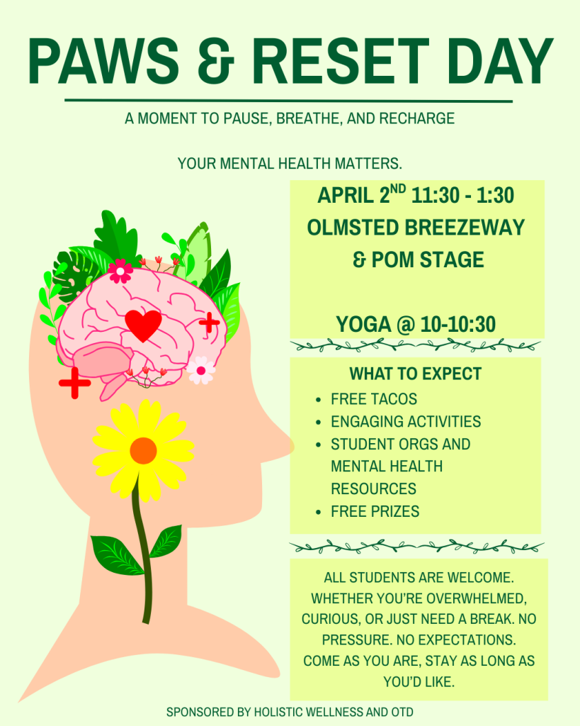 Take a moment to pause, breathe, and recharge at Paws & Reset Day on April 2. Join us in the Olmsted Breezeway and Pomerantz Stage from 11:30 a.m. to 1:30 p.m. for free tacos, activities, mental health resources, and giveaways. Start your day with yoga from 10–10:30 a.m.