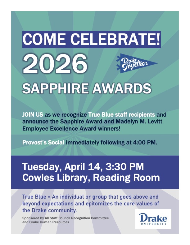 The April Provost’s Social will immediately follow the Sapphire Awards and begin at 4 p.m. in the same location. Refreshments will include an assortment of snacks and beverages. The Provost’s Social is a family friendly event. Feel free to bring your children or partner.