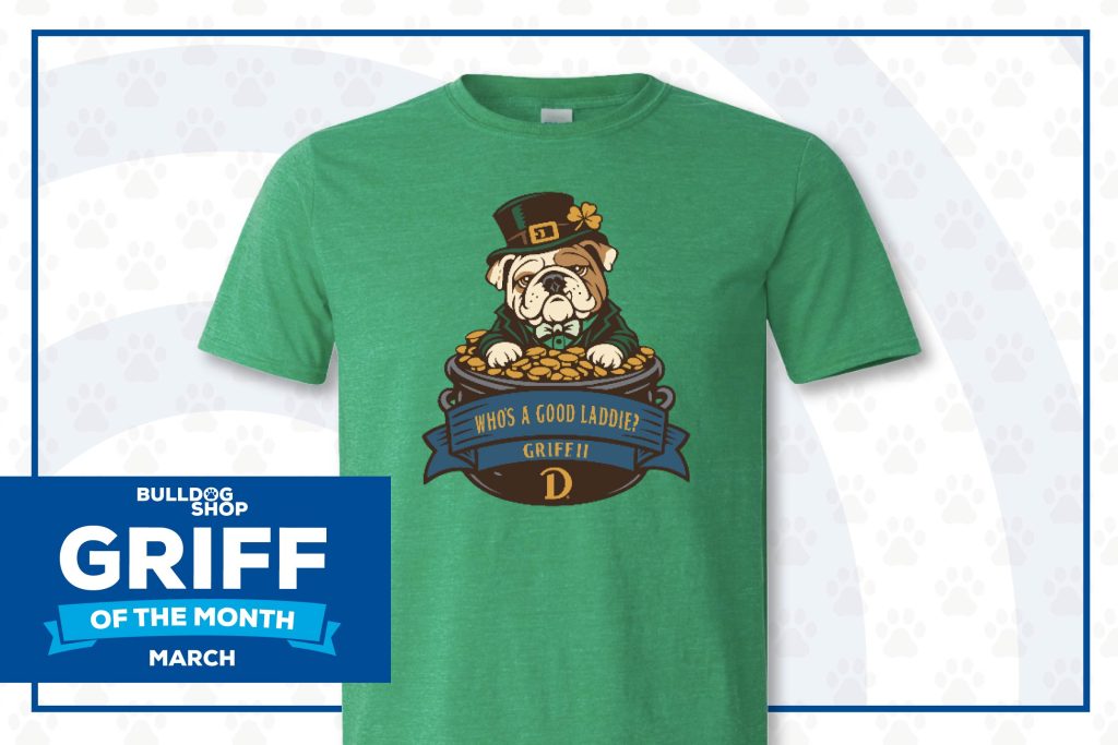 Dressed for St. Patrick’s Day and ready to celebrate, this festive design adds a little extra charm to your Bulldog gear lineup.