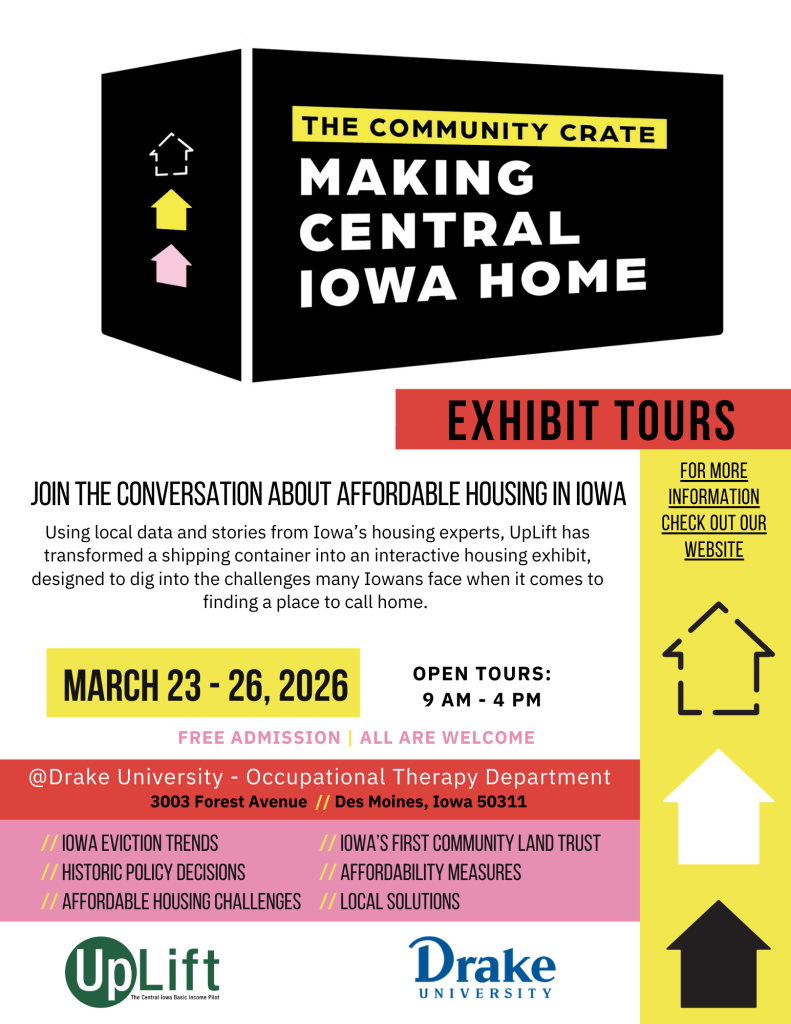 What is the Community Crate? Using local data and stories from Iowa housing experts, Uplift has transformed a shipping container into an interactive housing exhibit designed to dig into the challenges many Iowans face when it comes to finding a place to call home. Drake’s Occupational Therapy Doctoral Program has partnered with Uplift to host this exhibit, known as the Community Crate.