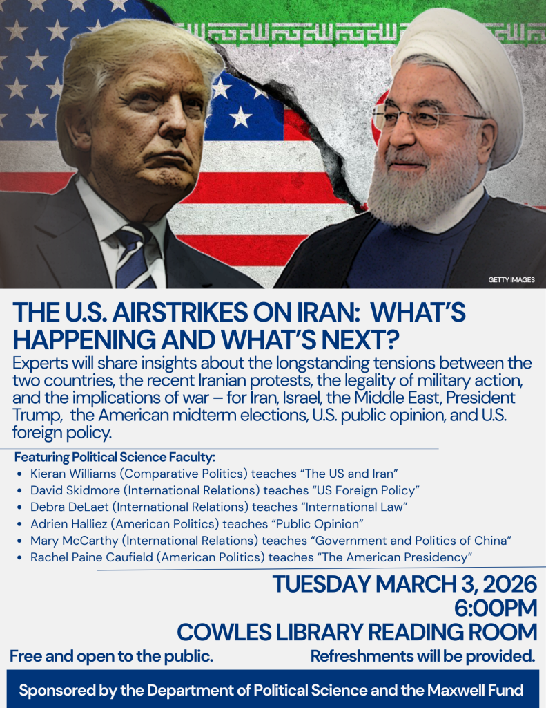 In light of recent military actions in Iran, Drake University’s Department of Political Science and the Maxwell Fund are hosting a panel discussion, “The U.S. Airstrikes on Iran: What’s Happening and What’s Next?” today, March 3, at 6 p.m. in the Cowles Library Reading Room. This event is free and open to the public. Refreshments will be provided.